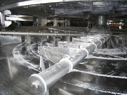 濕物料自加料器連續(xù)地加到干燥器上部第一層干燥盤上,帶有耙葉的耙臂做回轉(zhuǎn)運(yùn)動使耙葉連續(xù)地翻抄物料。物料沿指數(shù)螺旋線流過干燥盤表面,在小干燥盤上的物料被移送到外緣,并在外緣落到下方的大干燥盤外緣,在大干燥盤上物料向里移動并從中間落料口落入下一層小干燥盤中。大小干燥盤上下交替排列,物料得以連續(xù)地流過整個干燥器。中間的干燥盤內(nèi)通入加熱介質(zhì),加熱介質(zhì)形式有飽和蒸汽、熱水和導(dǎo)熱油,加熱介質(zhì)由干燥盤的一端進(jìn)入,從另一端導(dǎo)出。已干物料從最后一層干燥盤落到殼體的底層,最后被耙葉移送到出料口排出。濕份從物料中溢出,由設(shè)在頂蓋上的排濕口排出,真空型盤式干燥器的濕氣由設(shè)在頂蓋上的真空泵口抽出。從底層排出的干物料可直接包裝。通過配備翅片加熱器、溶劑回收冷凝器、布袋除塵器、干料返混機(jī)構(gòu)、引風(fēng)機(jī)等輔機(jī),可提高其干燥的生產(chǎn)能力,干燥膏糊狀和熱敏性物料,可方便地回收溶劑,并能進(jìn)行熱解和反應(yīng)操作。